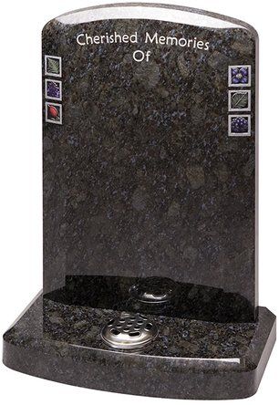 In Lavender Blue granite headstone and base option. The corner posts on this set have been bored to accept flower containers.