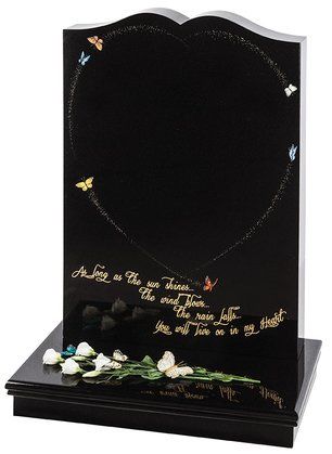 Lilies are a long established symbol of mourning. They are shown here carved on a contemporary heart shaped stone with either natural, unpainted flowers or with an ‘antiqued’ paint effect. Shown in Black granite.