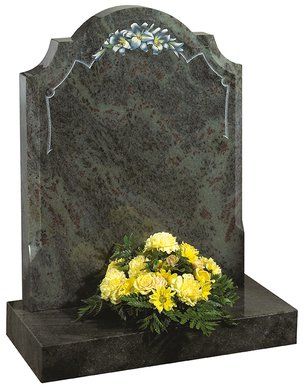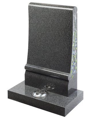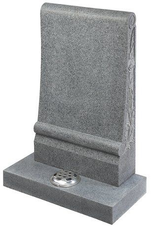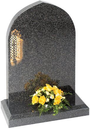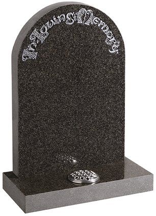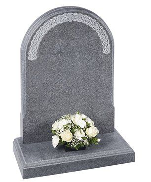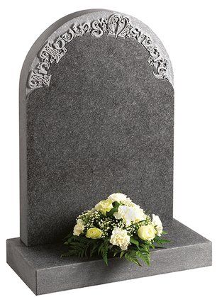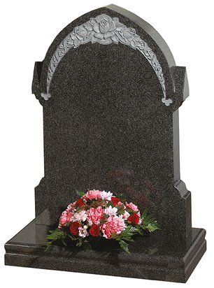 This ogee top memorial in South African Dark Grey granite has a honed finish and a deep cut floral border design.