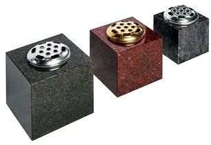In Lavender Blue granite headstone and base option. The corner posts on this set have been bored to accept flower containers.