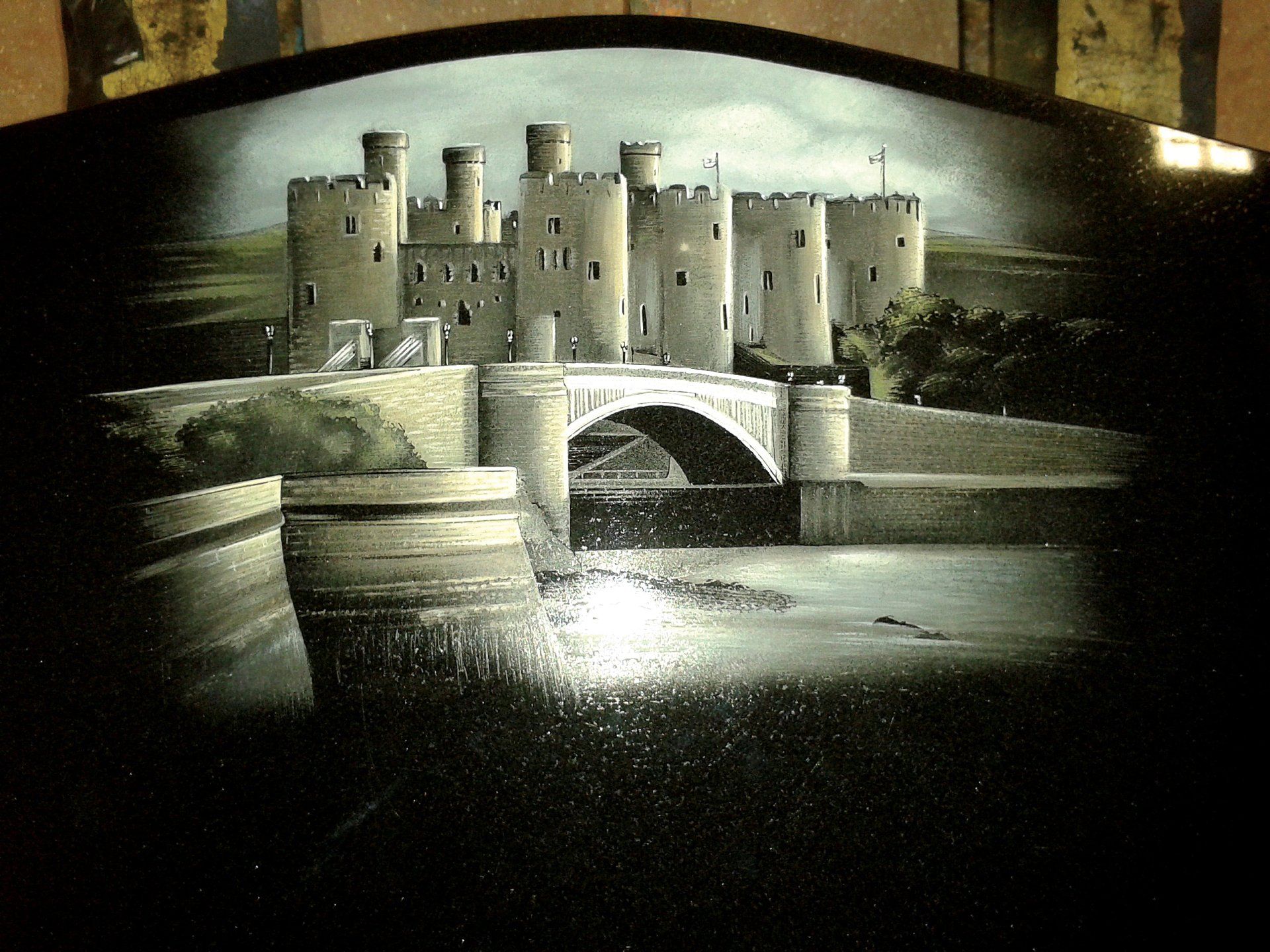 Picturesque waterfall and forest scene, can be created with or without the heading. Shown in Black granite with Pitched Edges.